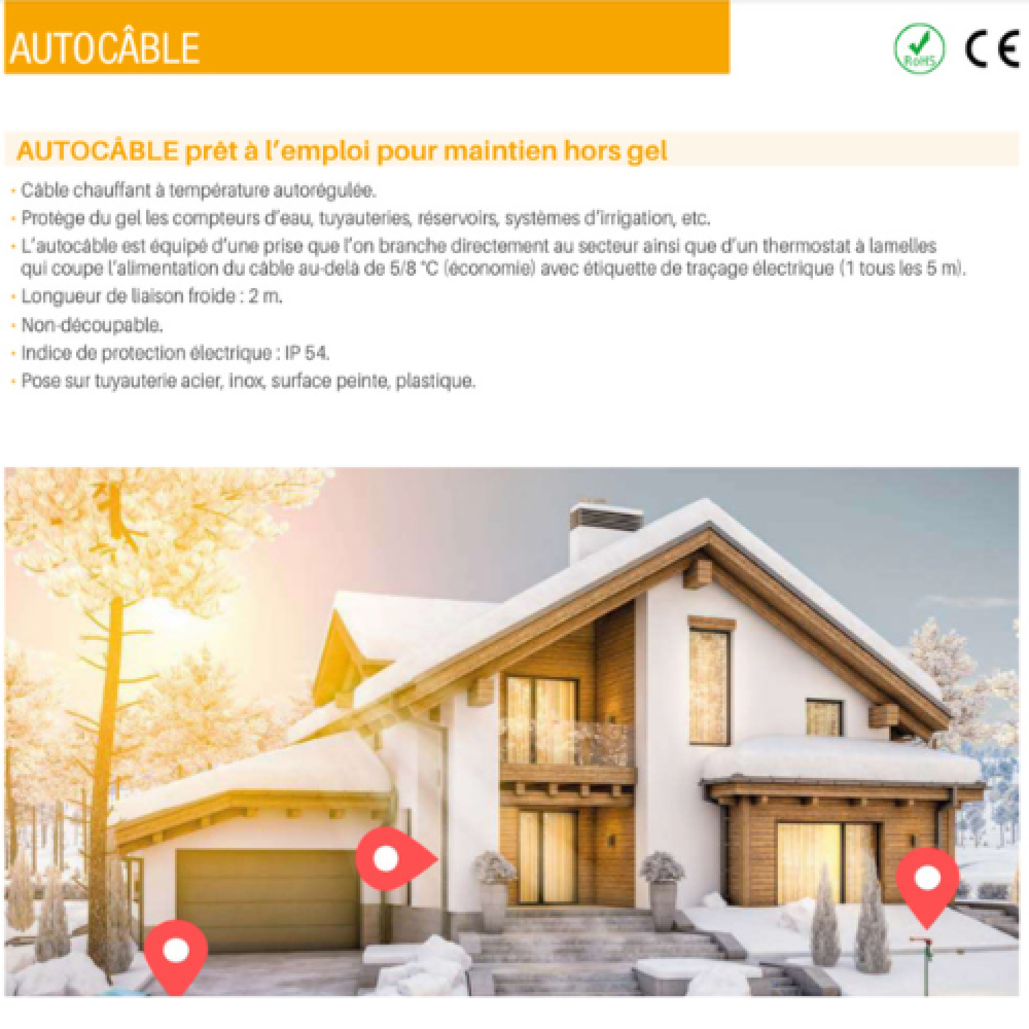 • L’autocâble est équipé d’une prise que l’on branche directement au secteur ainsi que d’un thermostat à lamelles qui coupe l’alimentation du câble au-delà de 5/8 °C (économie) avec étiquette de traçage électrique (1 tous les 5 m).